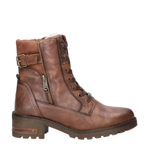 Deze Mustang veterboot heeft een profielzool en een rits- en vetersluiting. De buitenkant is gemaakt van imitatieleer en de voering van imitatiebont.