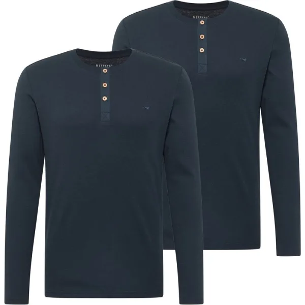 MUSTANG heren Arminto shirt met lange mouwen en Henley-kraag, set van 2. Effen shirt met lange mouwen, knoopsluiting en klein logo-borduurwerk. Zacht biologisch katoen zorgt voor hoog draagcomfort.