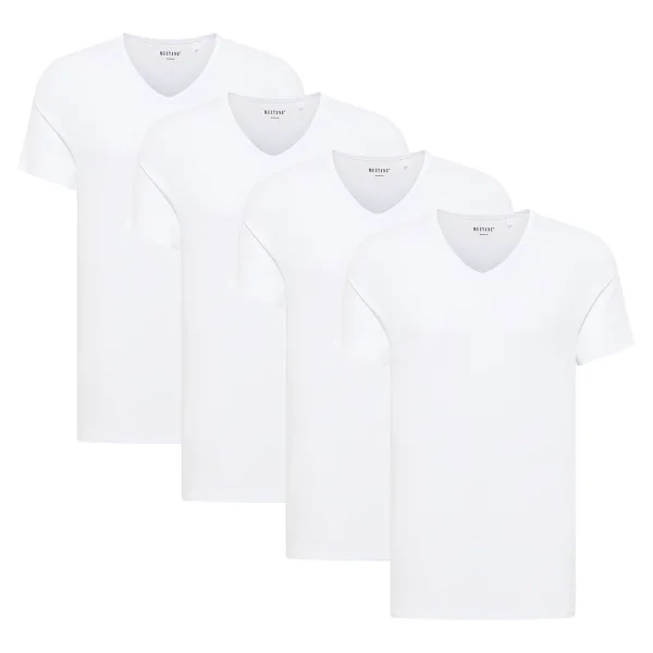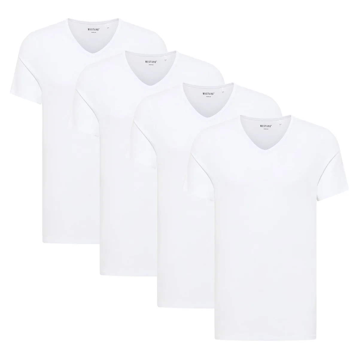 MUSTANG Heren Basic Shirt Amado in een verpakking van vier stuks. Casual T-shirt met V-hals en rechte zoom. Stofmix van duurzaam biologisch katoen met stretch.