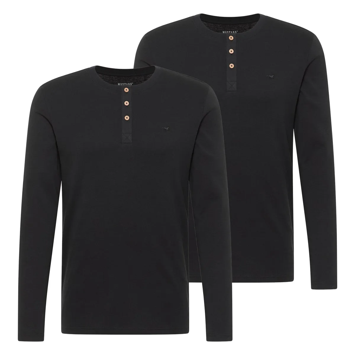 MUSTANG heren Arminto shirt met lange mouwen en Henley-kraag, set van 2. Effen shirt met lange mouwen, knoopsluiting en klein logo-borduurwerk. Zacht biologisch katoen zorgt voor hoog draagcomfort.
