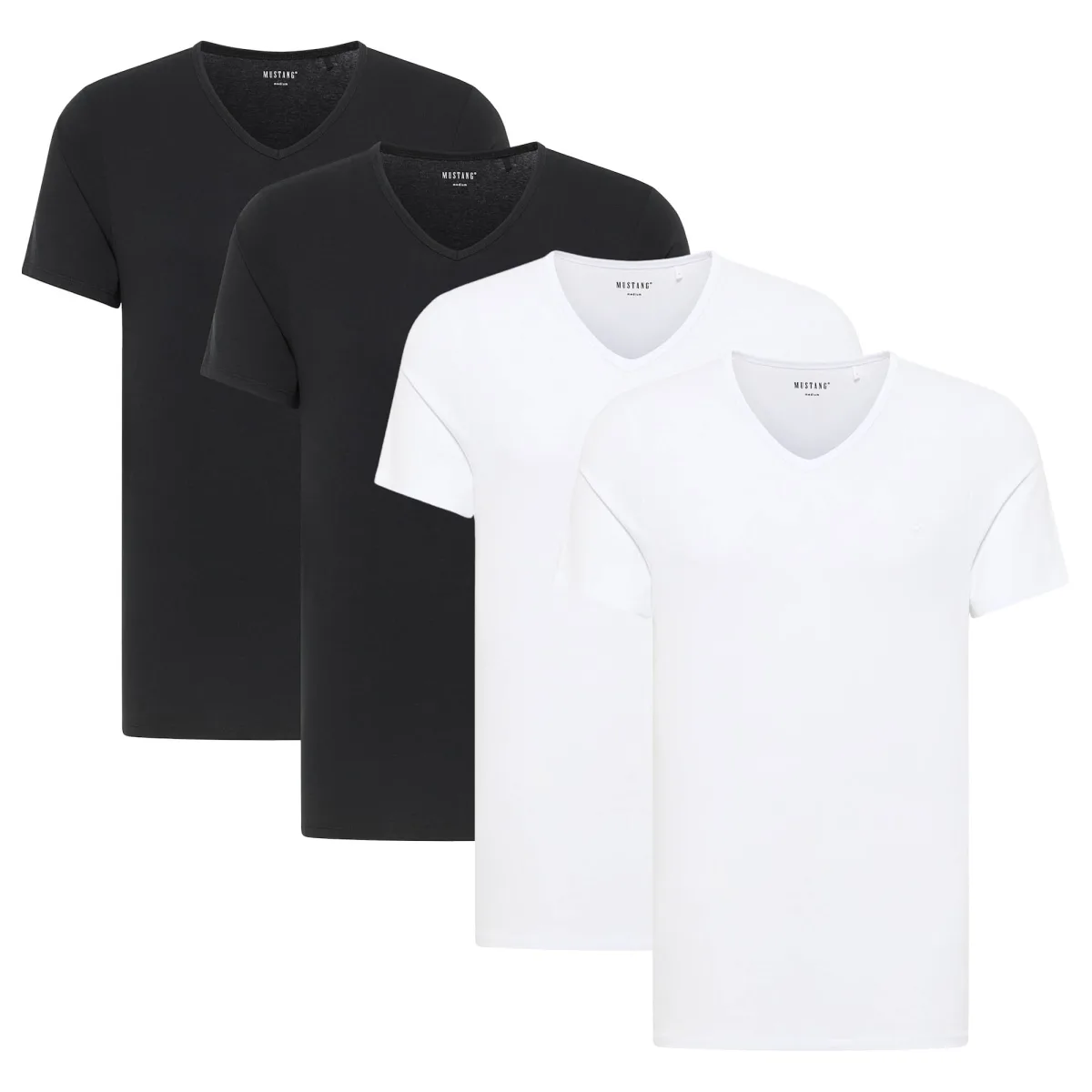 MUSTANG Heren Basic Shirt Amado in een verpakking van vier stuks. Casual T-shirt met V-hals en rechte zoom. Stofmix van duurzaam biologisch katoen met stretch.
