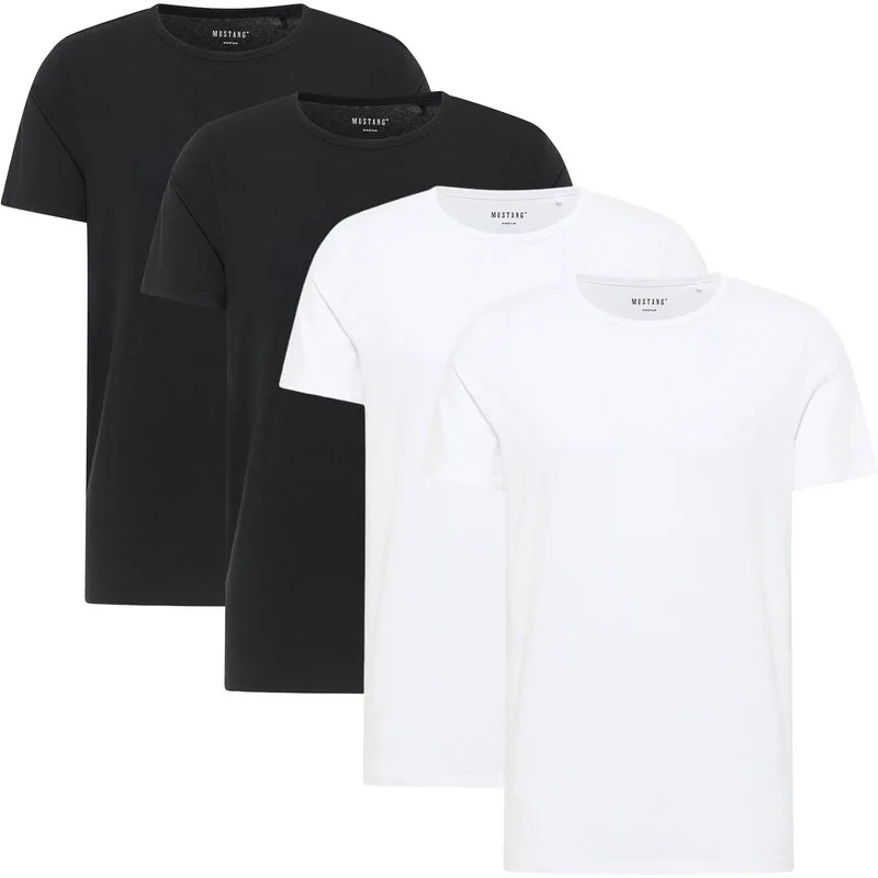MUSTANG basic herenoverhemd in een verpakking van vier stuks. Casual T-shirt met ronde hals en rechte zoom. Gemaakt van een mix van duurzaam biologisch katoen en stretch.
