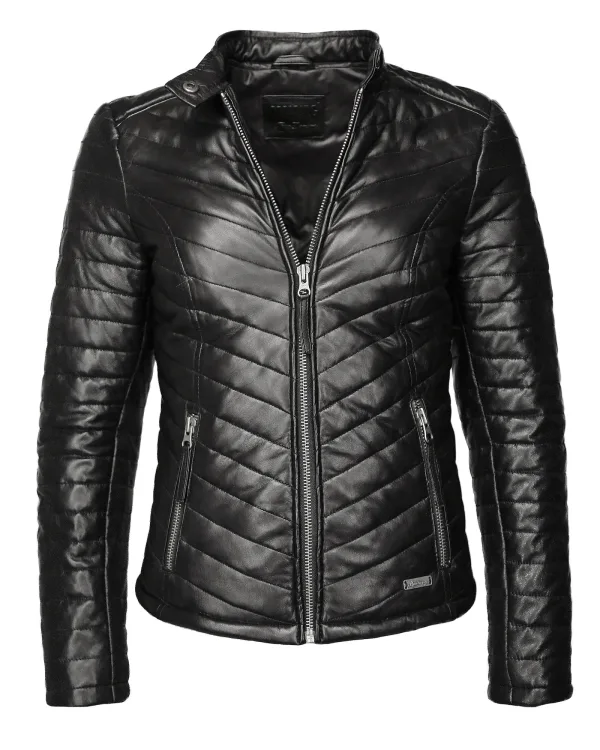 Design: Drukknopsluiting, Ritssluiting, Rechte zoom, Rugnaad, Staande kraag, Getailleerd model, Ritszakken aan de zijkant; Type jas: Bikerjack; Voering: Licht gevoerd; Materiaal: Leer; Motief: Effen; Extra's: Label plaatje, Glanzend, Stiksels, Op staal naden, Nappaleer, Lamsleer; Pasvorm: Slanke pasvorm