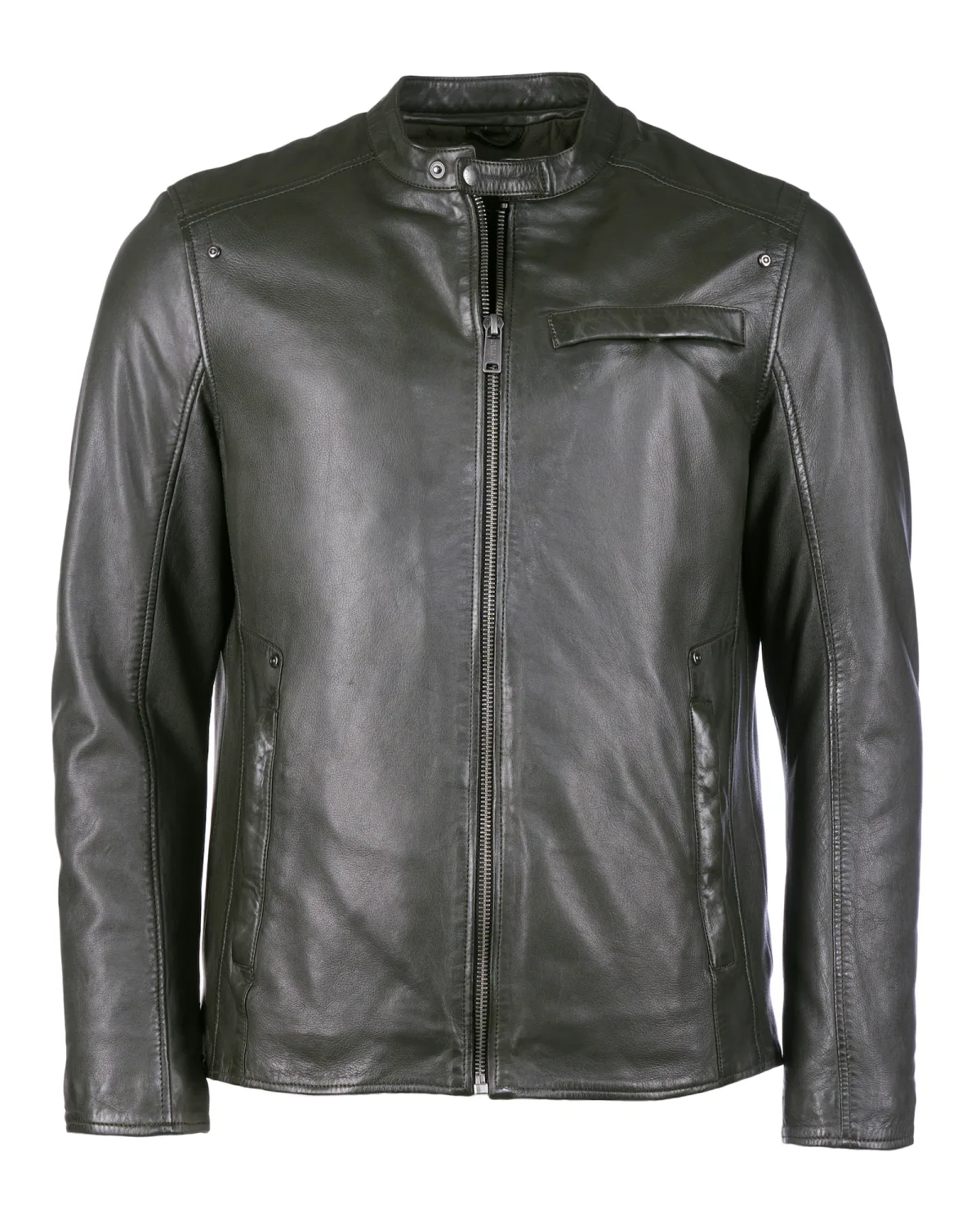 Design: Borstzak, Ritszakken aan de zijkant; Type sluiting: Ritssluiting; Type jas: Bikerjack; Voering: Licht gevoerd; Materiaal: Leer; Motief: Effen; Pasvorm: Normale pasvorm
