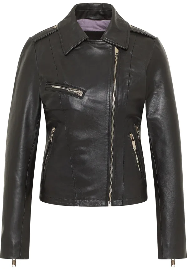 Design: Ritszakken aan de zijkant; Type sluiting: Ritssluiting; Type jas: Bikerjack; Voering: Licht gevoerd; Materiaal: Leer; Motief: Effen; Extra's: Gladde stof; Pasvorm: Slanke pasvorm