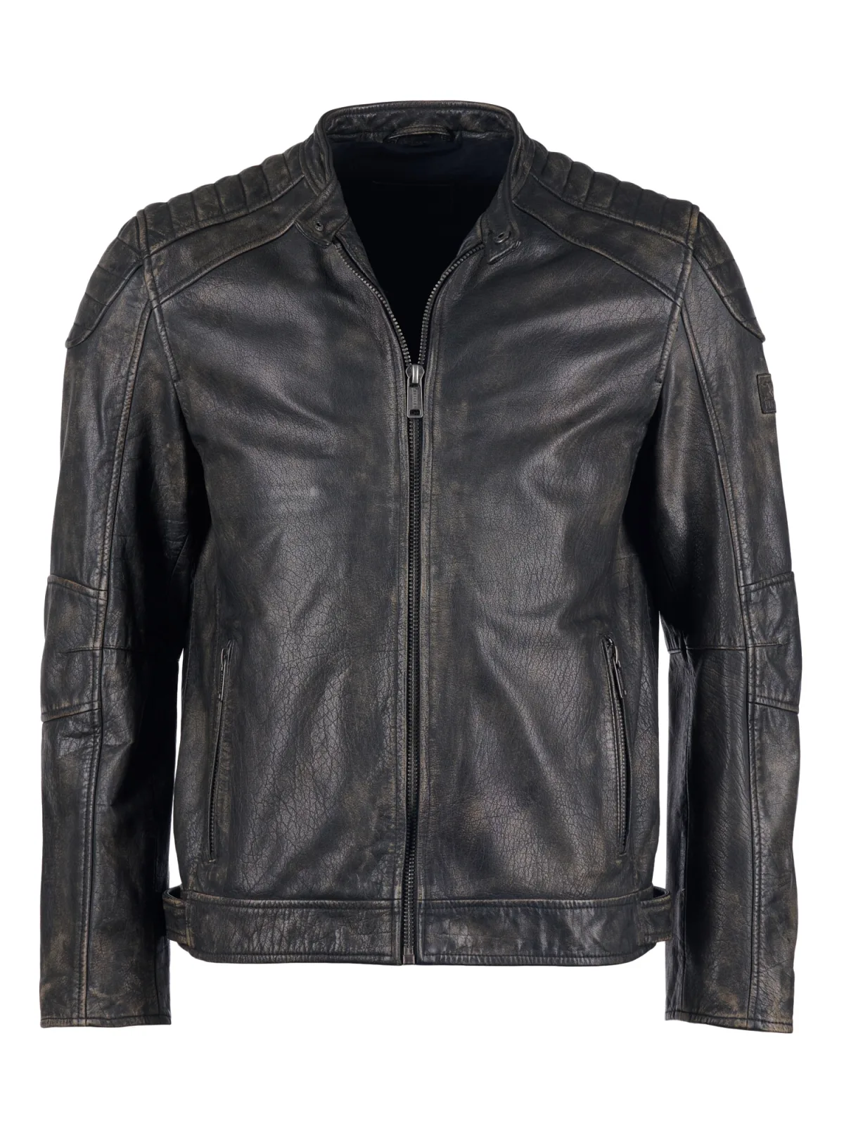 Maskuline Lederjacke im Vintage-Look mit Stehkragen und geradem Ärmelabschluss. Abgesteppte Schulternähte, aufgesetztes Logo am Ärmel und verstellbare Schnallen am Saum sorgen für markante Details. Ausgestattet mit Reißverschluss, Innen- und Außentaschen.