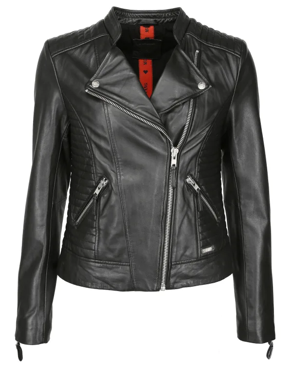 Design: Mouw rits, Staande kraag, Ritszakken aan de zijkant, Schuine rits; Type jas: Bikerjack; Voering: Licht gevoerd; Materiaal: Leer; Motief: Effen; Extra's: Label plaatje, Op staal naden, Stevige stof; Pasvorm: Normale pasvorm