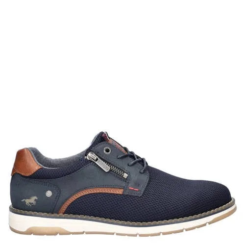 Voor een ontspannen, alledaagse look is deze Mustang heren sneaker een fijne basis. Het lage model in donkerblauw textiel oogt sportief en rustig, terwijl de meerkleurige details zorgen voor een subtiel accent. Door de combinatie van een soepele stof en een flexibele zool voelt elke stap licht en comfortabel.Licht, luchtig en comfortabel Bovenkant, voering en binnenzool gemaakt van textiel voor een zachte touch rond de voet Opengewerkte structuur van het materiaal zorgt voor goede ventilatie en helpt de voeten koel te houden Foam-voetbed biedt demping bij elke stap en verhoogt het draagcomfort Flexibele rubberen loopzool met goede grip voor een stabiel gevoel op verschillende ondergronden Platte zool met hakhoogte van 2,5 cm voor een ontspannen, dagelijkse pasvorm Normale leest, ideaal voor voeten met een standaard breedte Vetersluiting voor een verstelbare en aansluitende pasvormIdeaal voor dagelijks gebruikDeze sneaker past goed bij dagelijkse outfits zoals een jeans met T-shirt of een chino met polo. Het lichte, ademende textiel maakt het model geschikt voor langere dagen, bijvoorbeeld naar werk, stad of een casual afspraak. De zool met grip geeft vertrouwen tijdens het lopen, zowel binnen als buiten.Mustang, geïnspireerd op casual lifestyleMustang staat bekend om schoenen met een relaxte, moderne uitstraling die makkelijk in het dagelijkse leven passen. Het merk combineert comfortabele materialen met toegankelijke designs, zodat je eenvoudig een schoen kiest die bij je ritme van alledag aansluit.Een veelzijdige sneaker die jouw dagelijkse looks op een ontspannen manier compleet maakt.