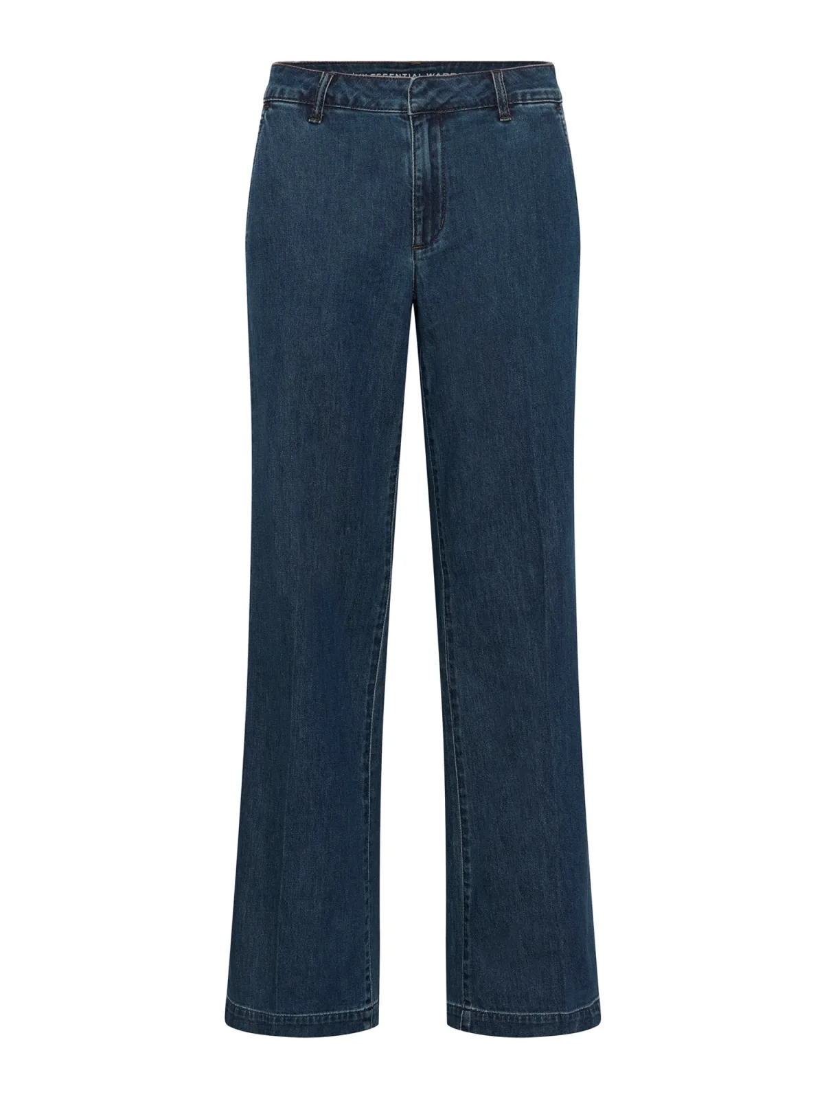 Damesjeans met wijde pijpen, rechte pasvorm en middelhoge taille. Voorzien van ritssluiting, knoop en riemlussen voor dagelijks comfort.