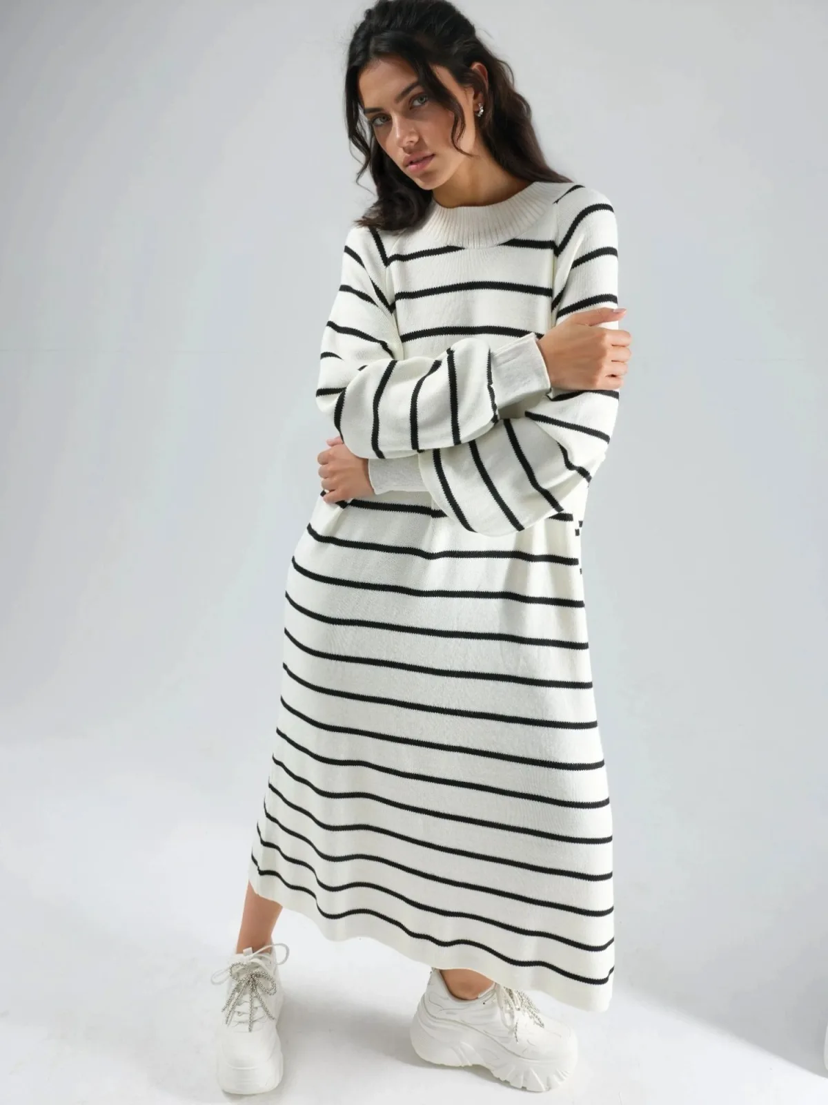 Design: Geribbelde kraag, Raglanmouwen, Geribd ceintuurtje; Materiaal: Knitwear; Halstype: Ronde hals; Motief: Gestreept; Extra's: All-over patroon; Lengte: 7/8 lengte; Snit: Recht; Pasvorm: Losse pasvorm; Armlengte: Lange mouw