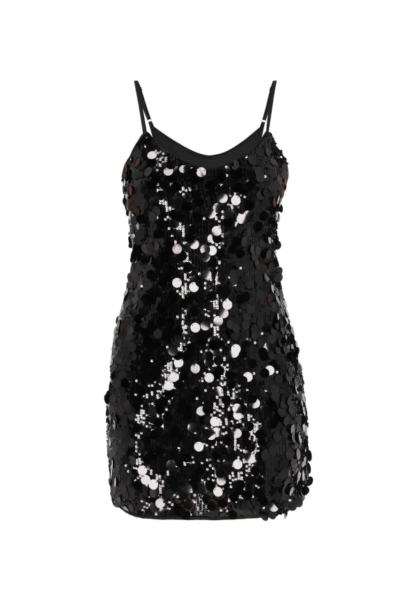 Design: Rechte zoom, Diepe snit/decolleté; Halstype: V-hals; Motief: Effen; Soort bandjes: Spaghettibandjes; Details: Pailletten; Extra's: Glitterend, Verstelbare bandjes, Gestructureerd oppervlak; Lengte: Kort/mini; Snit: Figuur omarmend; Pasvorm: Slanke pasvorm; Armlengte: Mouwloos
