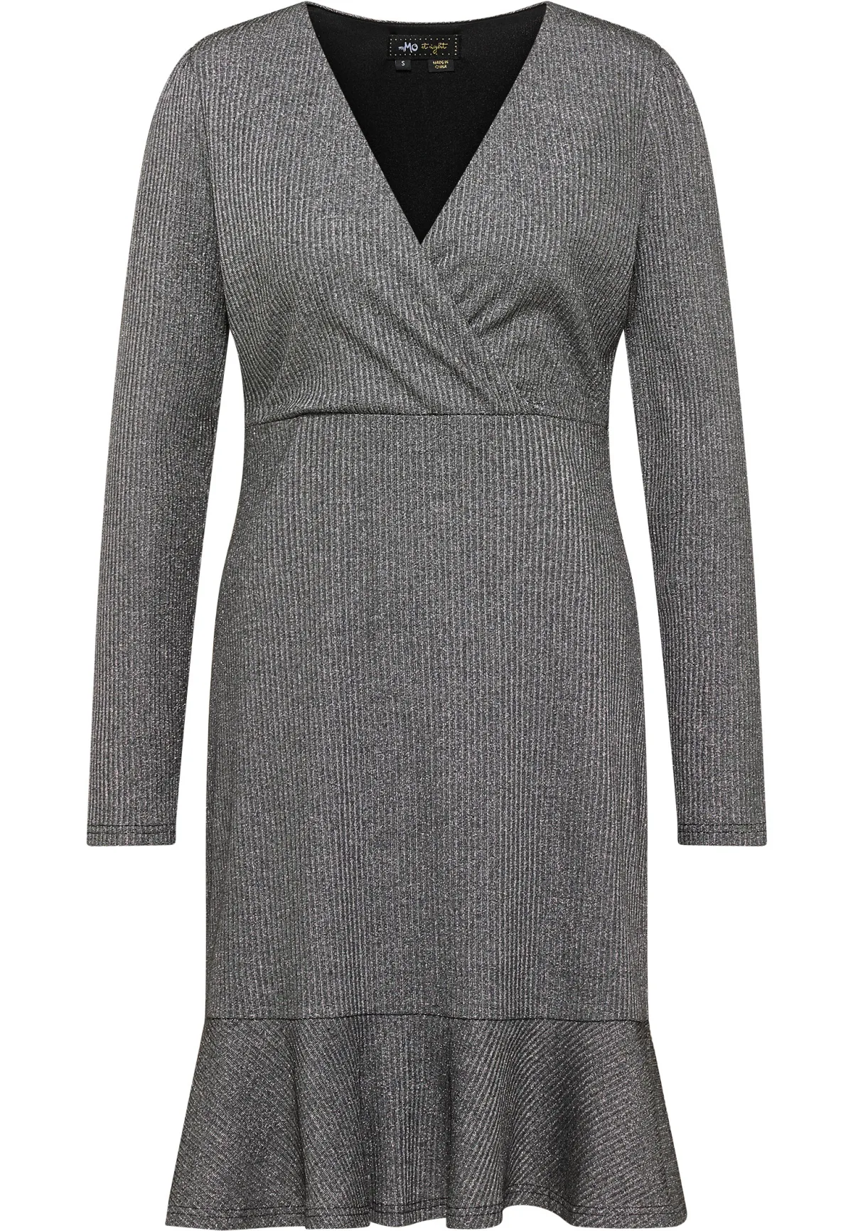 Alle ogen op jou gericht! En alleen op jou: Met deze jersey jurk van myMo at night doe je dat in een handomdraai. De zachte glitters op het fijne ribbelbreisel geven je instant elegante glamour. Ook het ontwerp met een V-halslijn in een geraffineerde wikkellook en de knielange snit van het rokgedeelte zorgen daarvoor. De rok is licht uitlopend en eindigt in een losse en licht zwierige stuiterzoom. Draag hem met je mooiste feestschoenen en je bent de ster van de avond.