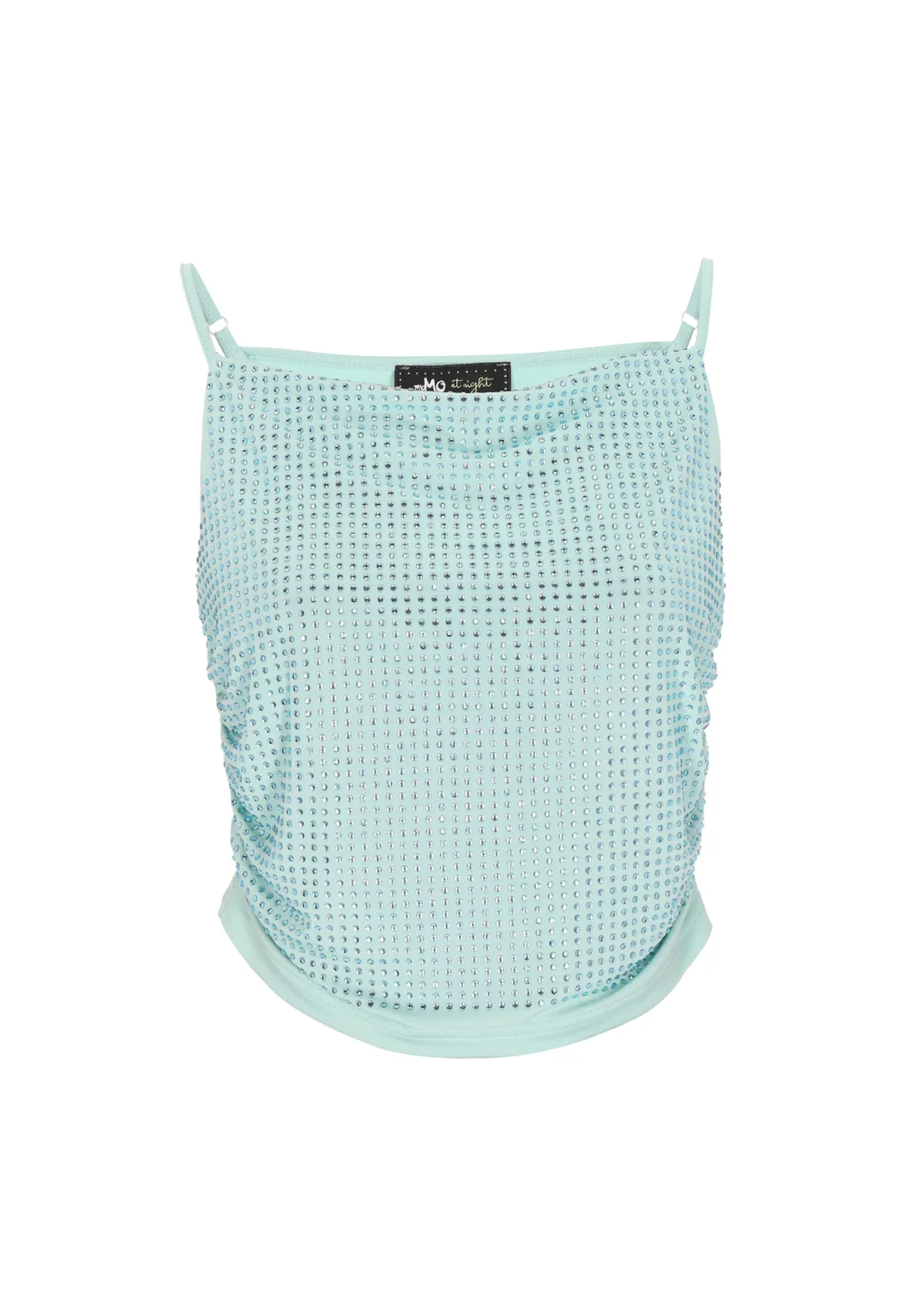 Design: Gevoerde zoom/rand; Halstype: Ronde hals; Motief: Effen; Soort bandjes: Spaghettibandjes; Details: Sierstenen; Extra's: Glitterend; Pasvorm: Slanke pasvorm; Armlengte: Mouwloos; Lengte: Korte pasvorm