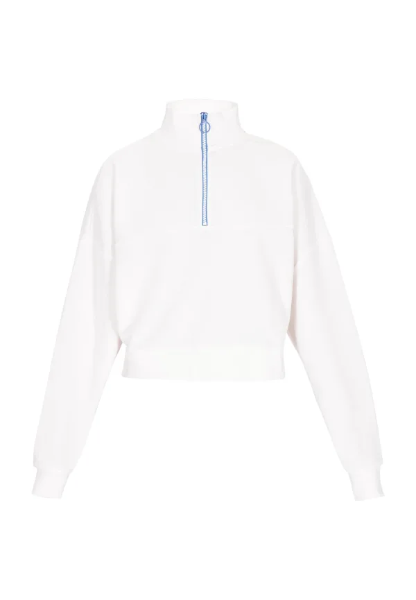 Design: Rechte zoom, Overcut schouder, Halve rits; Type sluiting: Ritssluiting; Materiaal: Sweatstof; Halstype: Schipperskraag; Motief: Effen; Extra's: Op staal naden, Voelt zacht aan; Pasvorm: Losse pasvorm; Armlengte: Lange mouw; Lengte: Korte pasvorm