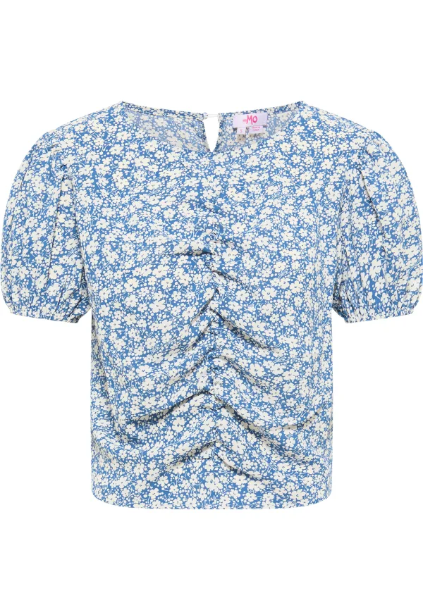 Geen voering/geen voering, geen vulling De stijlvolle cropped blouse Spring Flowers van myMo maakt meteen indruk. De blouse is gemaakt van een zachte katoenmix en ontworpen in een vrouwelijke pasvorm. Langs de ronde hals loopt een gedrapeerde naad en de korte pofmouwen zijn geoptimaliseerd met elastische manchetten bij de manchetten. De blouse sluit met een klein knoopje in de nek en een verborgen ritssluiting in de zijnaad. Een perfecte outfitoplossing voor spontane dates. Blouse