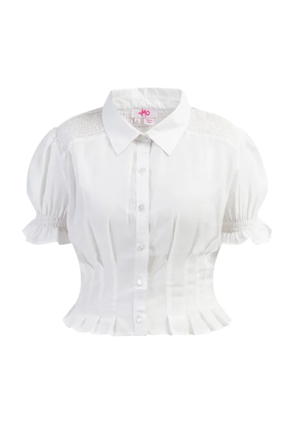 Witte blouses zijn altijd een musthave geweest in elke garderobe. Ze zijn variabel en kunnen als geen ander kledingstuk worden gecombineerd. Dit model is gemaakt van lichtgewicht materiaal en heeft gesmokte schouders. De korte pofmouwen eindigen eveneens in gesmokte manchetten. De smalle taille is versierd met plooien, wat hem een bijzonder charmante uitstraling geeft. blouse met korte mouwen