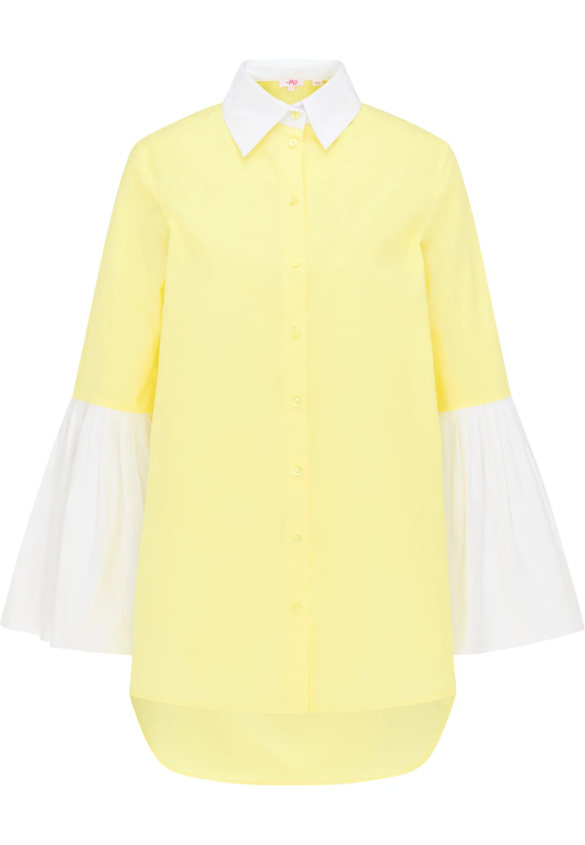Deze lang gesneden blouse van myMo is voor echte fashionista's! Dit trendy stuk van 100% katoen maakt indruk door de liefdevol gedetailleerde afwerking, die vooral tot uiting komt in de contrasterende kraag en mouwen. De lange mouwen lopen tot aan de ellebogen in een smalle lijn en maken vervolgens indruk met pompeus vallende trompetafwerkingen - heel opvallend. De afgeronde zoom is aan de achterkant langer dan aan de voorkant en een boxplooi aan de achterkant geeft een geraffineerd accent aan uw look.