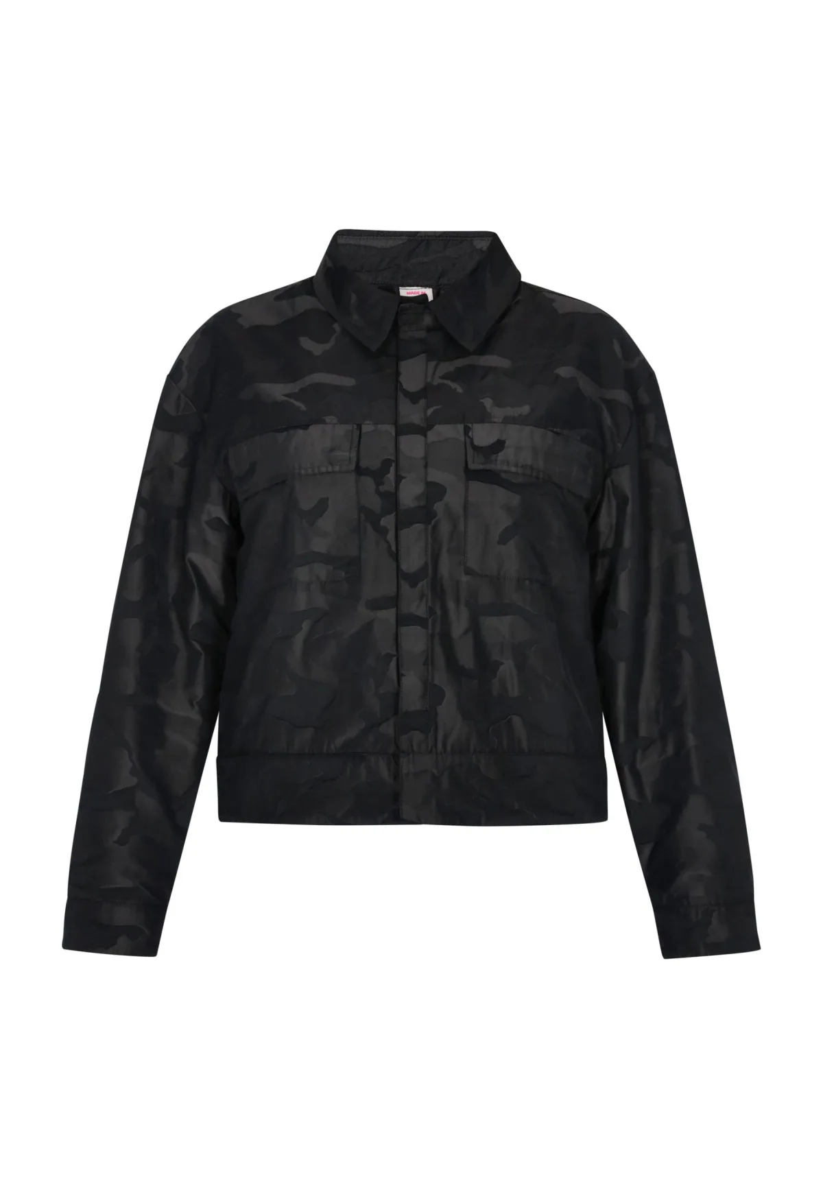 Maak kennis met een jasje met een opvallend camouflagepatroon, een kraag en een sluiting aan de voorkant met een verborgen ritssluiting onder de zichtbare knoopsluiting. Met twee borstzakken met klepsluitingen en een elastische of getailleerde zoom, kan dit kledingstuk een casual, functionele stijl belichamen die vaak wordt geassocieerd met outdoor- of militair geïnspireerde kleding. Blouson