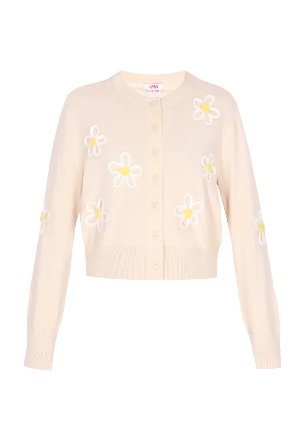 Design: Geribd ceintuurtje; Type sluiting: Knoopsluiting; Materiaal: Knitwear; Halstype: Ronde hals; Motief: Bloemenprint; Extra's: Applicaties; Pasvorm: Normale pasvorm; Armlengte: Lange mouw; Lengte: Normale lengte