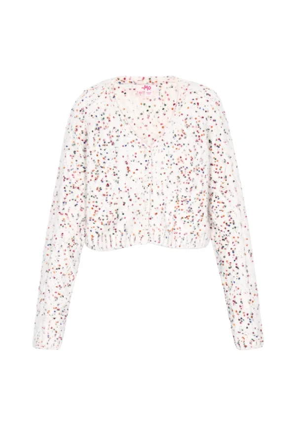 Design: Knop placket, Geribd ceintuurtje, Knop sluiting; Type sluiting: Knoopsluiting; Materiaal: Knitwear; Halstype: V-hals; Extra’s: All-over patroon; Pasvorm: Normale pasvorm; Armlengte: Lange mouw; Lengte: Korte pasvorm