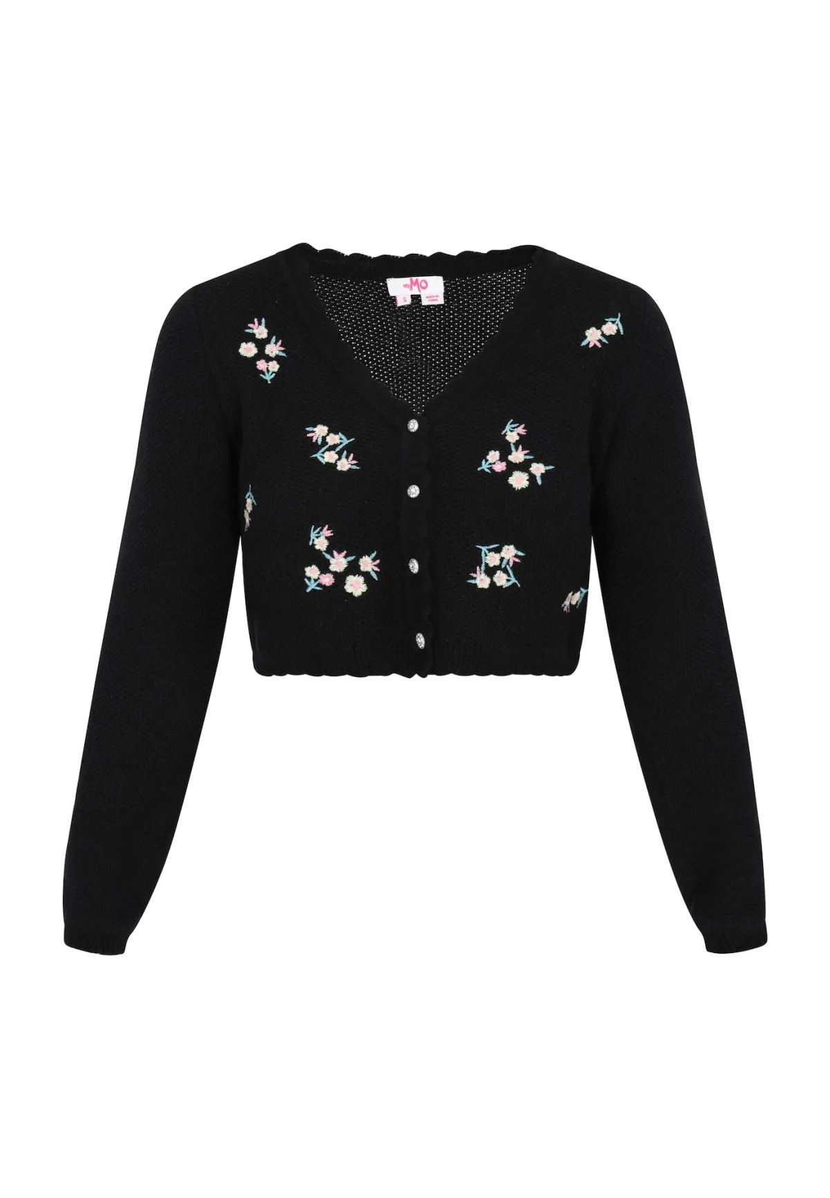 Design: Knop placket, Geribd ceintuurtje; Type sluiting: Knoopsluiting; Materiaal: Knitwear; Halstype: V-hals; Motief: Bloemenprint; Details: Borduursels; Extra’s: Met textuur, Voelt zacht aan; Pasvorm: Normale pasvorm; Armlengte: Lange mouw; Lengte: Korte pasvorm