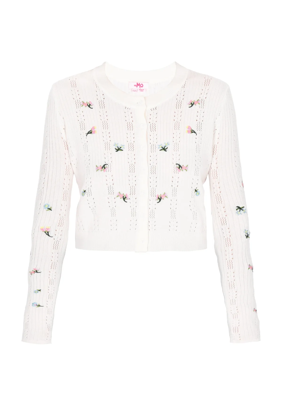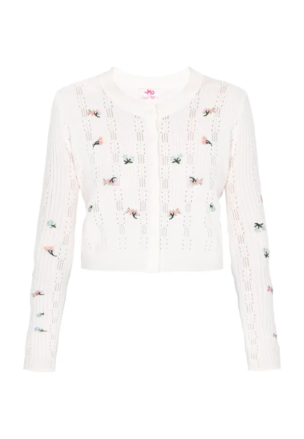 Design: Geribbelde kraag; Type sluiting: Knoopsluiting; Materiaal: Knitwear; Halstype: Ronde hals; Motief: Bloemenprint; Details: Borduursels, Mesh; Extra's: Fully fashioned; Pasvorm: Normale pasvorm; Armlengte: Lange mouw; Lengte: Normale lengte
