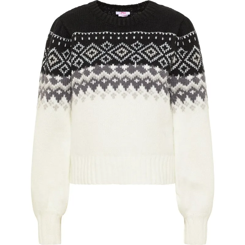 Deze trendy myMo grof gebreide trui kruidt de klassieke Noorse trui echt. De zachte wolmix met een klassiek fair isle-patroon wordt een stijlvol ontwerp dankzij de glinsterende metallic draden. De korte en slanke pasvorm heeft licht gepofte mouwen die naar het einde toe breder worden. De klassieke ronde hals en manchetten zijn gemaakt van vormvast ribbreisel. In de kleurencombinaties past de trui perfect bij elke vorm van denim.