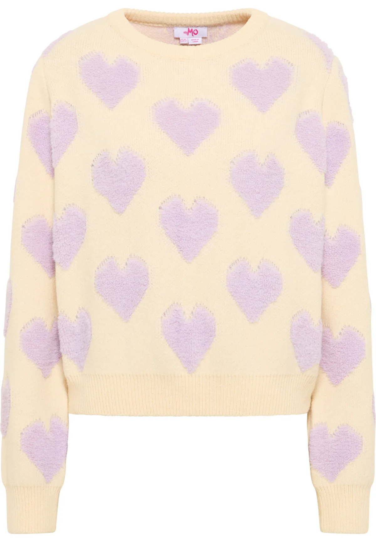 Geen voering/geen voering, geen vulling Hand op hart: De koude winterdagen willen we allemaal wegknuffelen met deze trui van myMo. Het zachte garen is dik gebreid en de hartjesinleg komt goed tot zijn recht als donzige 3D-motieven. In combinatie met dikke laarzen creëer je in een handomdraai een trendy stijlbreak. Gebreide trui