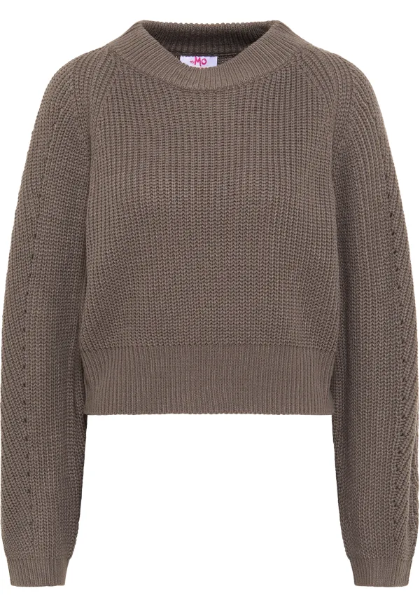 Gebreide truien in cropped stijl zijn nog steeds erg populair. Deze zachte pullover van myMo richt zich op de trendy korte vorm en combineert die slim met sportieve raglanmouwen. Een stoere ribbel bij de ronde hals en een speciaal breisel bij de mouwen maken het ontwerp compleet.