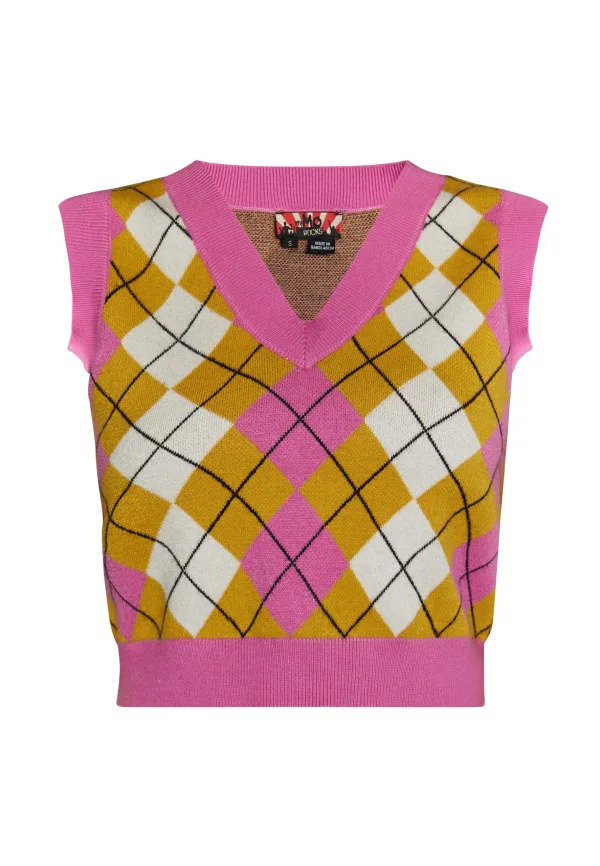 Terugkeer van de diamant! Het Schotse Argyle-patroon is een echte klassieker, populair voor golf, schooluniformen of sokken. Ook het patroon evergreen is erg populair bij myMo ROCKS. Het zachte sweatervest in een contrasterende kleurenmix is gemaakt van een viscosemix, heeft een cropped snit en is afgewerkt met effen geribde manchetten. Met stevige bikerlaarzen creëer je een casual break in stijl. Gebreide vest