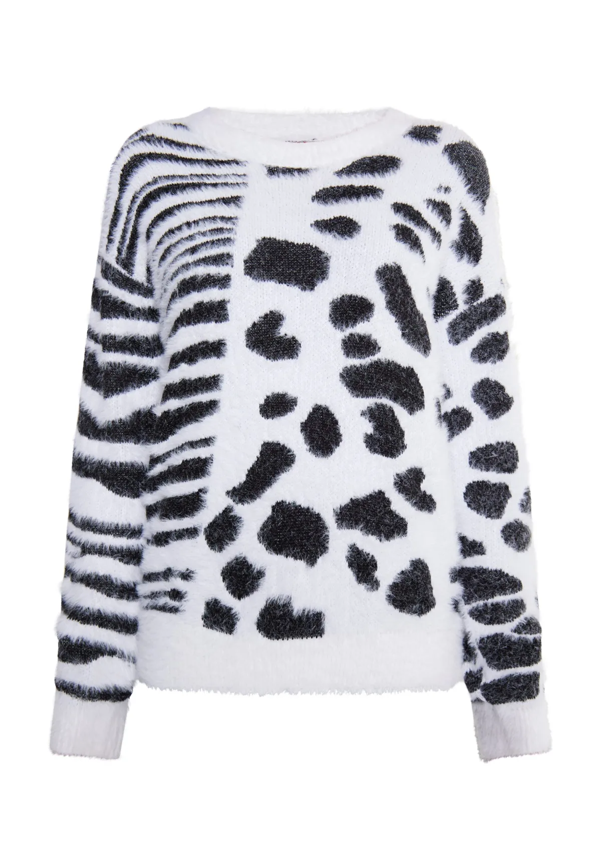 Wilde fusie. Je kunt je herfstbreikledingcollectie verrijken met de dierenpatroonmix van leeuw en zebra. Gemaakt van een zacht, geborsteld franjegaren, de trui van myMo ROCKS is gemakkelijk te combineren. Met zijn losse pasvorm en geribde manchetten past hij perfect bij elk type denim. Gebreide trui