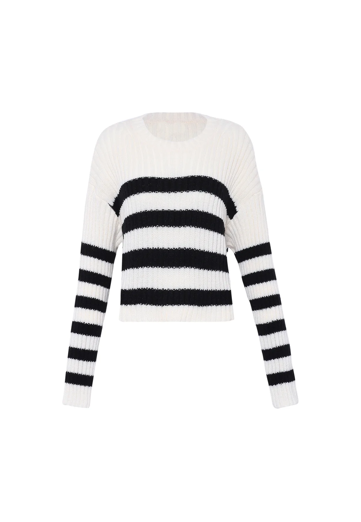 Deze cropped trui heeft een geribde gebreide textuur en een ronde hals die een casual charme uitstraalt. Horizontale strepen omringen het kledingstuk, inclusief de mouwen, waardoor een samenhangende look ontstaat. Dit kledingstuk met lange mouwen en een aansluitend model dat net boven de natuurlijke taille valt, biedt warmte in een middelzware tot zware stof. Het effen kleurenpatroon op de manchetten en halslijn complementeert een van de strepen voor extra verfijning. Pullover trui