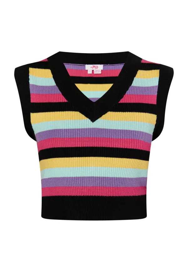 Solo of als laagje: de gestreepte gebreide trui van myMo brengt een frisse wind in je garderobe. Het cropped model is gemaakt van een zachte viscosemix, heeft een V-hals en oogt bijzonder harmonieus door de effen randen. Gedragen op een broek met hoge taille of over een blouse, creëer je in een mum van tijd een frisse look. Gebreide vest