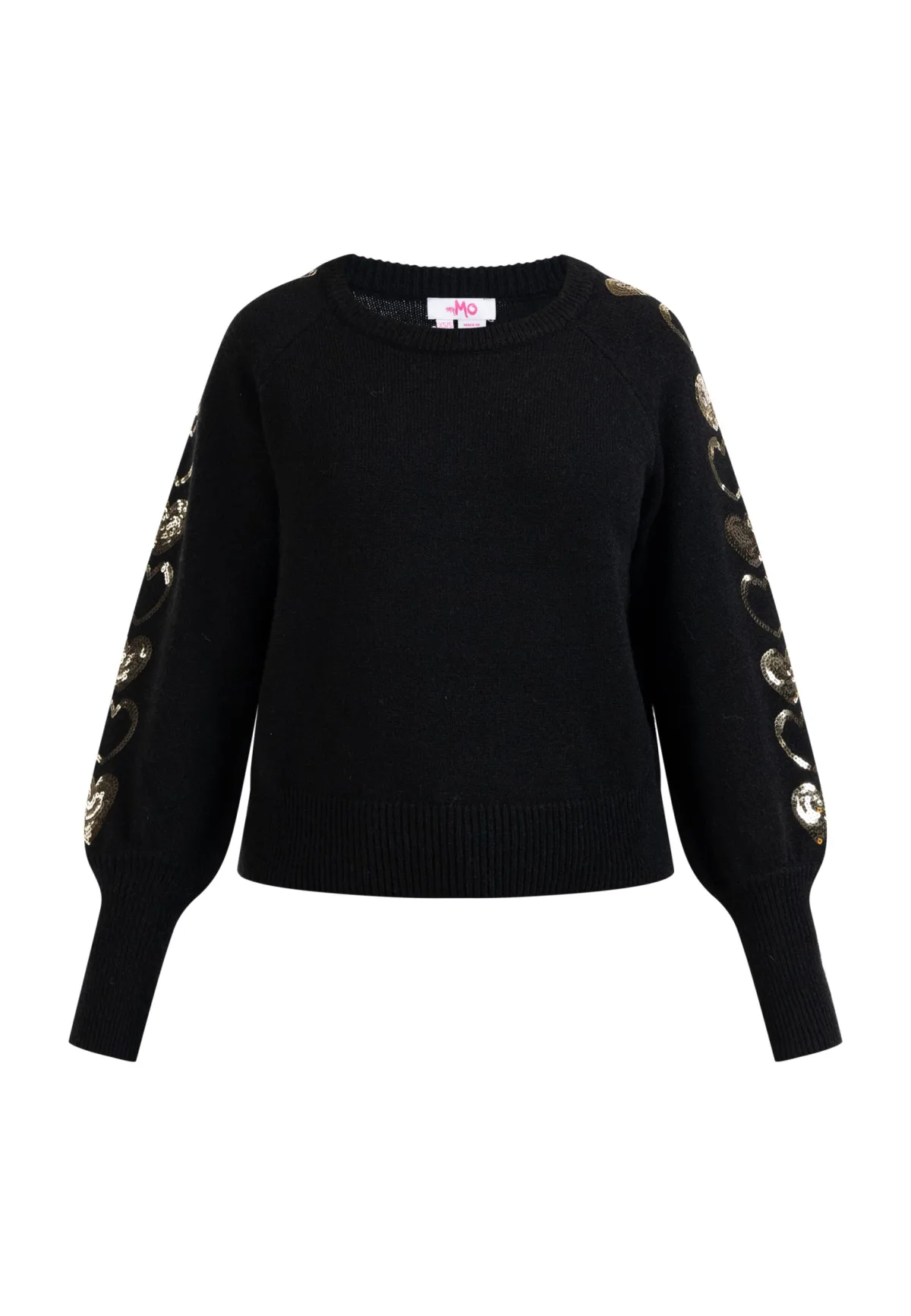 Hart van goud! Op de mouwen zijn verschillende hartjes geborduurd in goudkleurige pailletten. Dit is een trui van myMo die zowel overdag als 's avonds kan worden gecombineerd. De zachte garenmix en de wijde raglanmouwen met lange gebreide manchetten ronden het mooie ontwerp af.