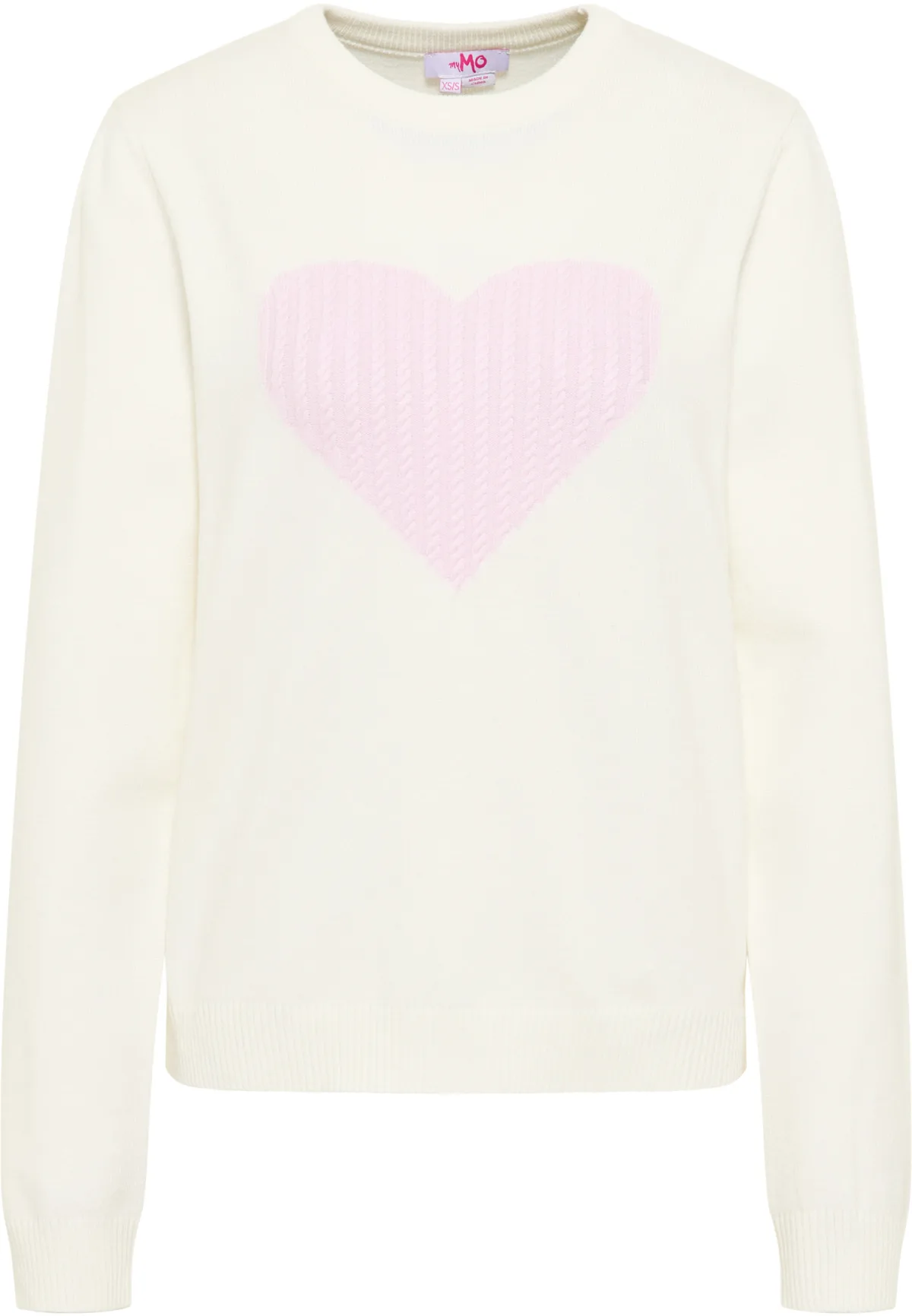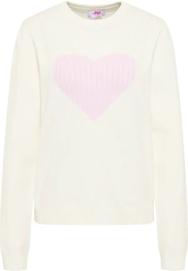 MyMo weet hoe je harten sneller laat kloppen met deze trui in intarsia breisel. Het zachte garen met viscosegehalte voelt zeer aangenaam aan en is voorzien van een gestructureerd hart met kabelpatroon. Het klassieke silhouet met ronde hals en gebreide manchetten zorgt voor de laatste accenten.