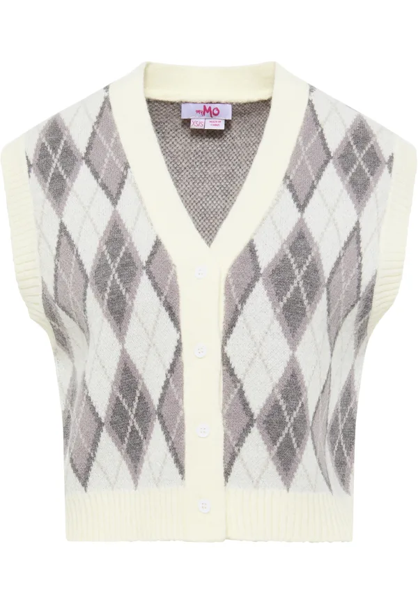 Geen voering/geen voering, geen vulling Opa's vest wordt een leuk kledingstuk. Hoe? De manier waarop myMo het heeft geherinterpreteerd. myMo heeft het typische argyle patroon een echte make-over gegeven met zachte pastelkleuren. Het nauwsluitende korte model en het licht oversized ontwerp maken de zoete, geïmpliceerde boyfriend-look compleet. Dit gebreide gilet laat je outfit echt stralen met een (skinny) jeans en laarzen of sneakers. Gebreide vest