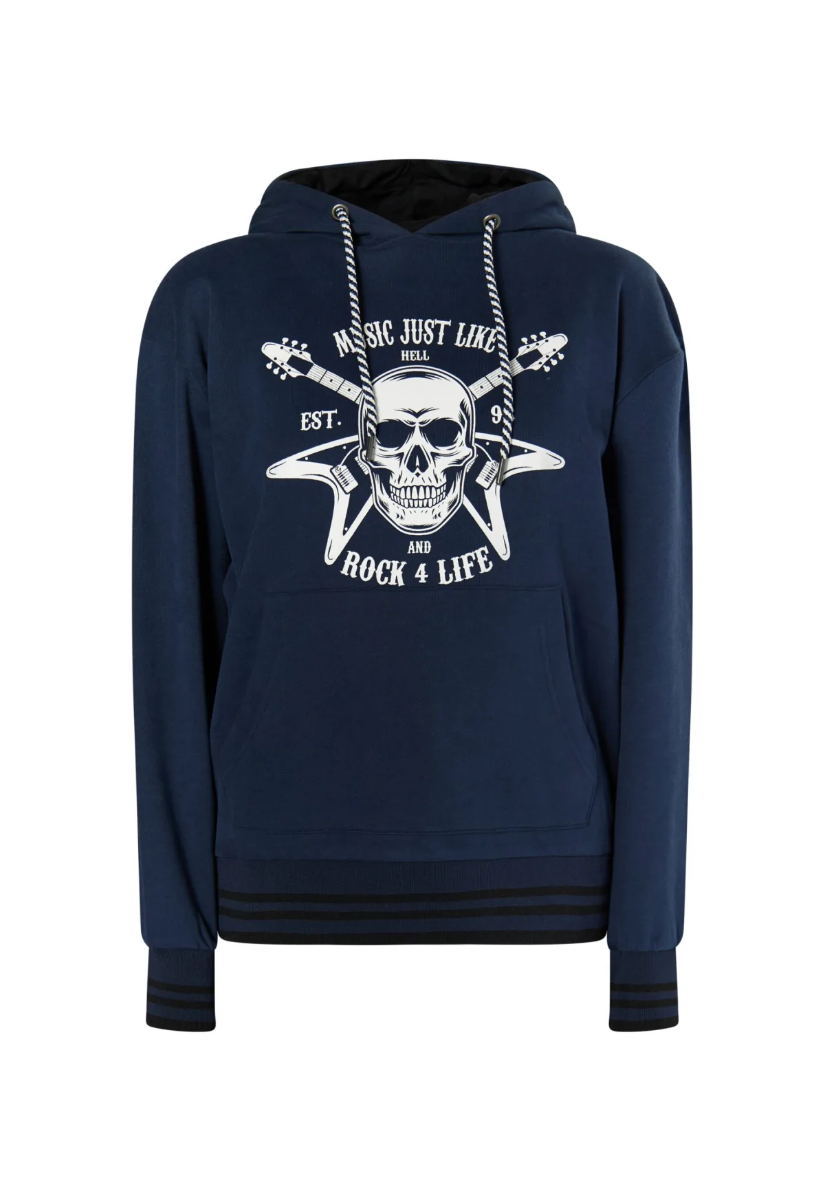 De rocking hoodie van myMo ROCKS is gemaakt van zacht katoen, heeft een capuchon met tweekleurig koord en heeft een stoere uitstraling. De contrasterende strepen op de manchetten en de schedelprint maken de trui tot een trendy statement piece. Hoodie
