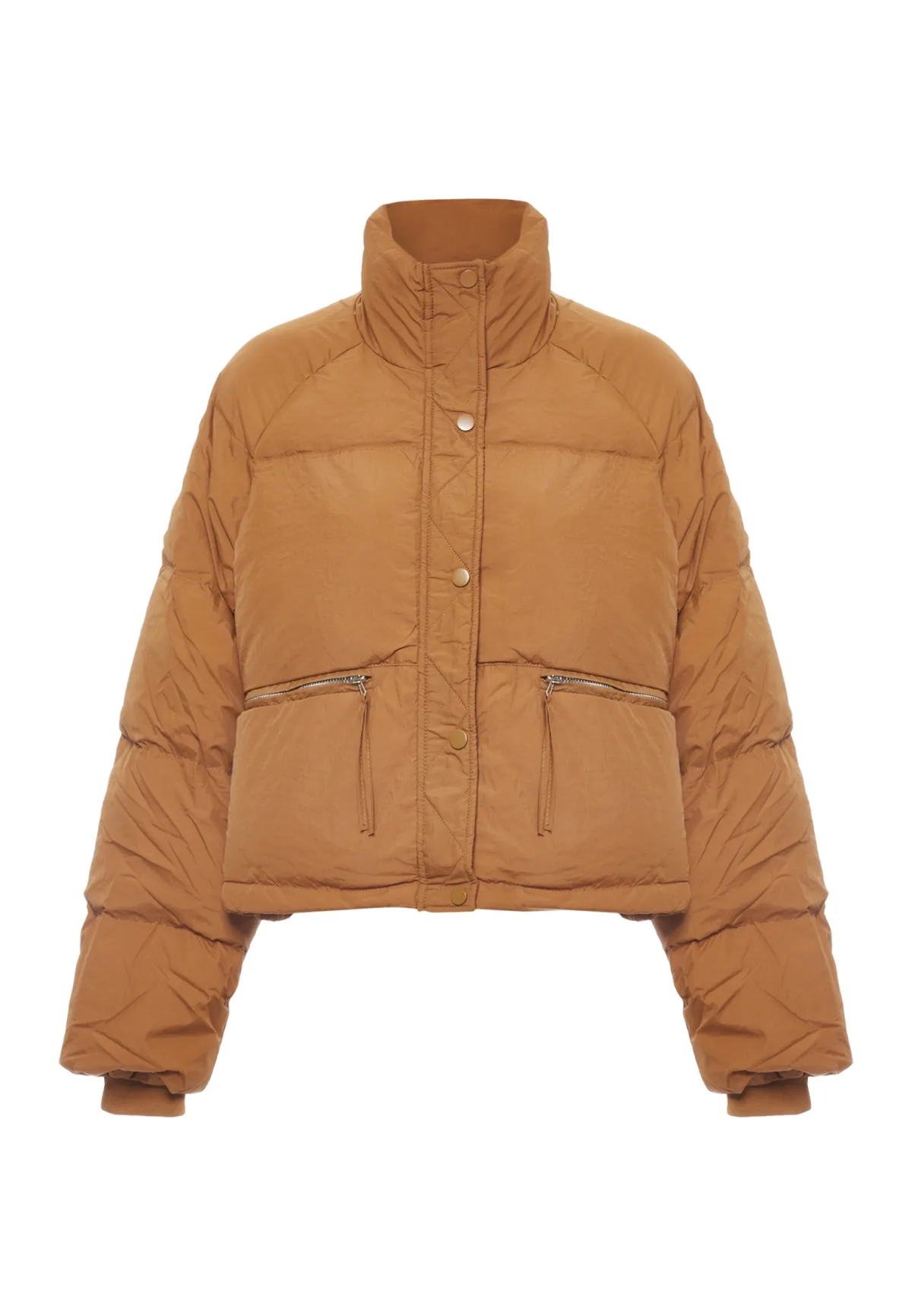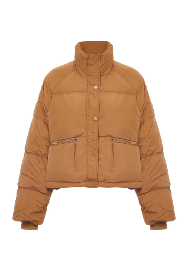 Dit pufferjack is ontworpen voor koude dagen en heeft een cropped silhouet met een gezellige hoge kraag. De drukknoopsluiting zorgt voor een goede pasvorm, terwijl het horizontale gewatteerde patroon textuur toevoegt. Met zakken met ritssluiting en elastische manchetten is deze jas zowel stijlvol als functioneel voor avonturen bij koud weer.