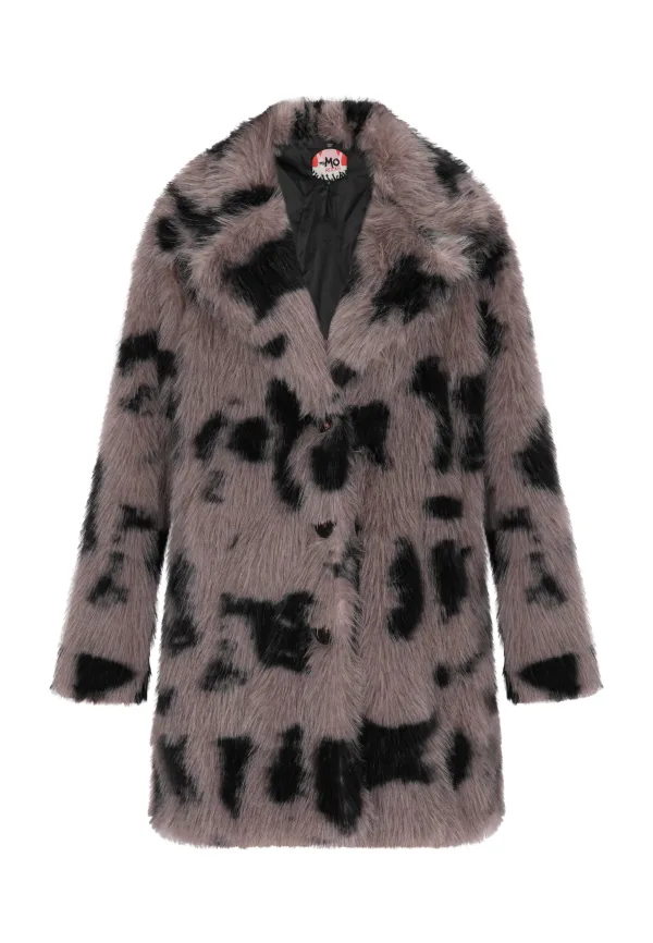 Deze bontjas met print heeft een opvallende Dalmatische print, die een dierlijke charme uitstraalt. De zachte, getextureerde stof bootst het uiterlijk van bont na, waardoor een luxueus gevoel ontstaat. Deze jas heeft een klassieke kraag en een recht silhouet en is perfect voor kouder weer. Met verborgen sluiting aan de voorkant en lange mouwen, biedt het zowel stijl als warmte. Jas