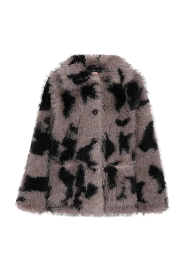 Breid je garderobe uit met dit bedrukte zwart-witte bontjack met een uniek Dalmatisch printontwerp. Het kraagloze silhouet en de verborgen sluiting voegen een vleugje verfijning toe, terwijl de zachte buitenkant comfort biedt. Perfect om een opvallend dierenprintstatement aan je outfit toe te voegen. Jas