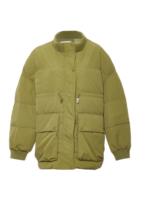 Dit pufferjack is ontworpen voor koude dagen en heeft een geribde kraag en ritssluiting aan de voorkant. Horizontaal quilten zorgt voor isolatie en een volumineuze uitstraling. Op heuphoogte bevinden zich twee grote klepzakken met drukknopen, aangevuld met verticale ritszakken aan de bovenkant voor extra gemak. Elastische manchetten en zoom zorgen voor een goede pasvorm, terwijl het stoffen label op de kraag hoogwaardige merken aangeeft.