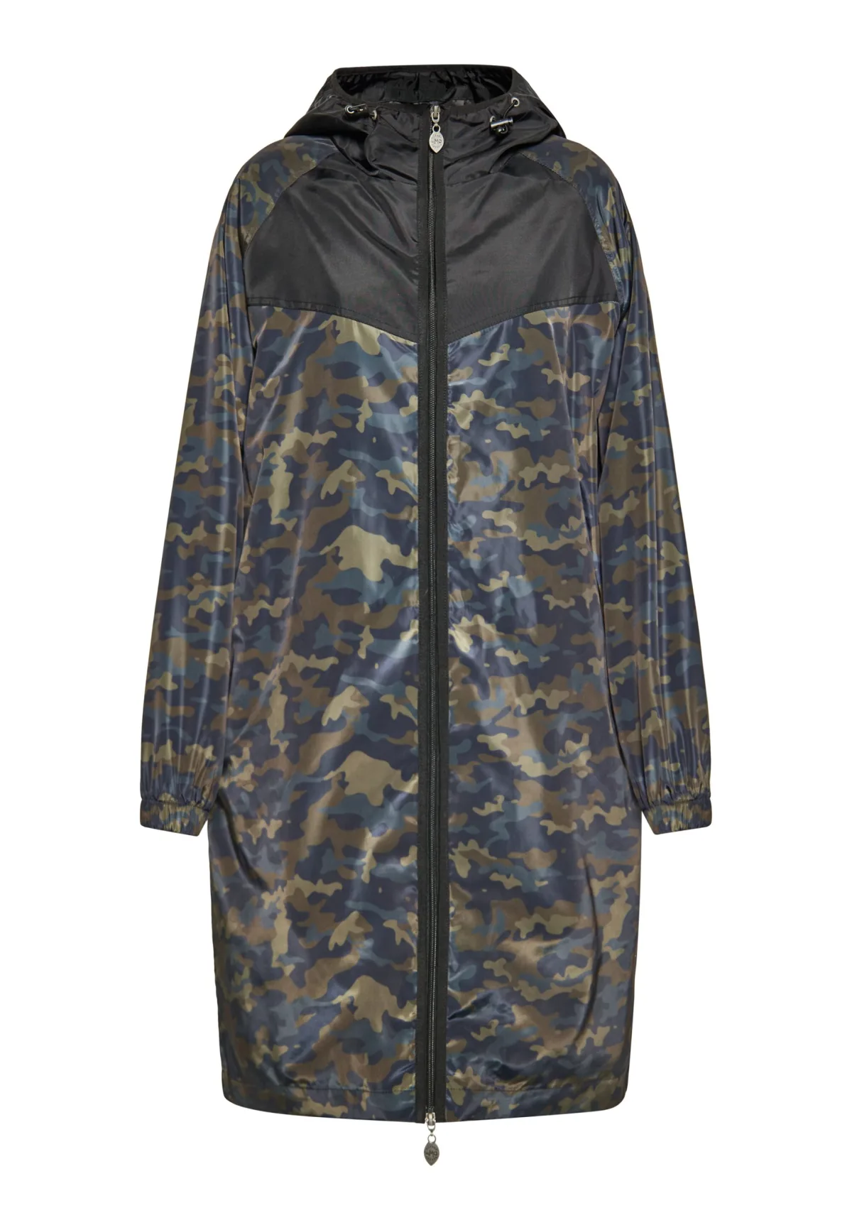 Dit outwear-stuk introduceert een sportieve windjack met camouflagepatroon en is ontworpen voor buitenactiviteiten. Met een ritssluiting over de volledige lengte en een capuchon met verstelbaar trekkoord biedt hij bescherming tegen de elementen. Elastische manchetten en een rechte zoom voegen functionaliteit toe aan deze langere jas, perfect voor slechte weersomstandigheden. Jas