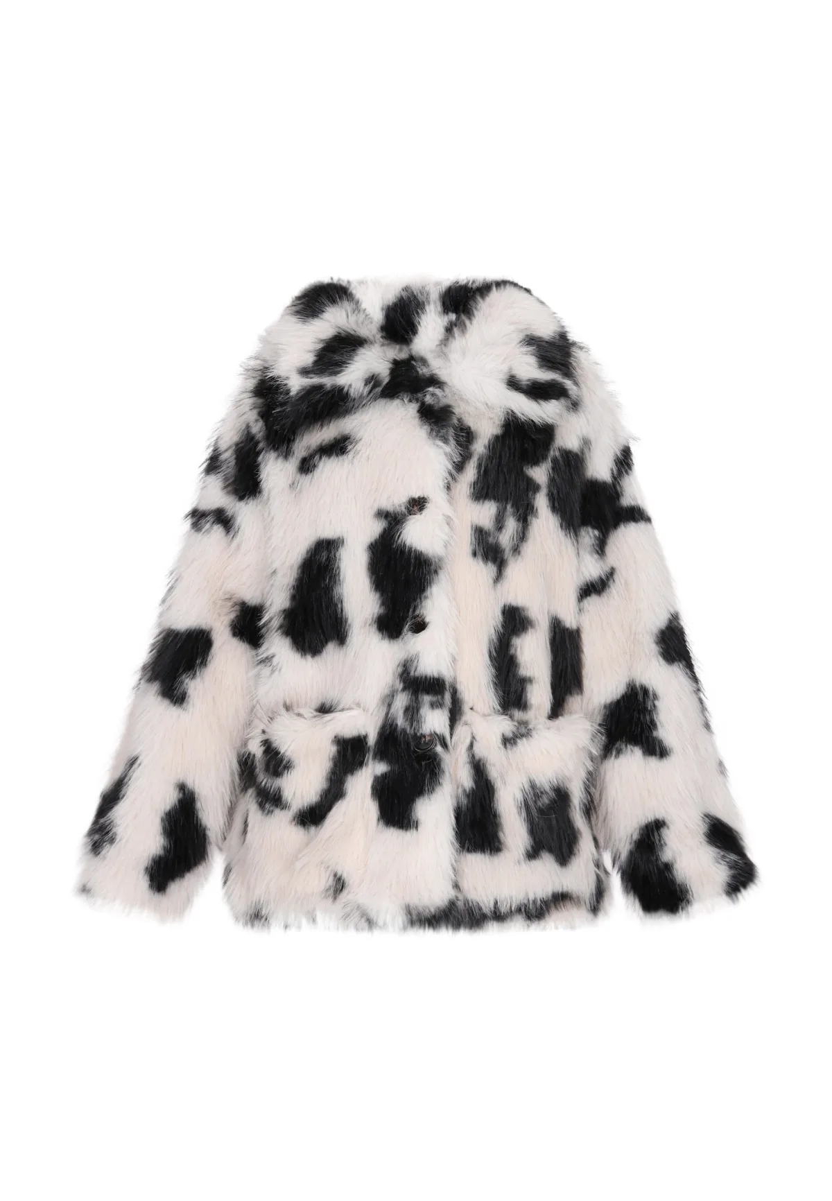 Breid je garderobe uit met dit bedrukte zwart-witte bontjack met een uniek Dalmatisch printontwerp. Het kraagloze silhouet en de verborgen sluiting voegen een vleugje verfijning toe, terwijl de zachte buitenkant comfort biedt. Perfect om een opvallend dierenprintstatement aan je outfit toe te voegen. Jas
