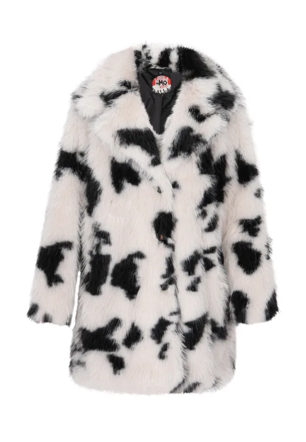 Deze bontjas met print heeft een opvallende Dalmatische print, die een dierlijke charme uitstraalt. De zachte, getextureerde stof bootst het uiterlijk van bont na, waardoor een luxueus gevoel ontstaat. Deze jas heeft een klassieke kraag en een recht silhouet en is perfect voor kouder weer. Met verborgen sluiting aan de voorkant en lange mouwen, biedt het zowel stijl als warmte. Jas