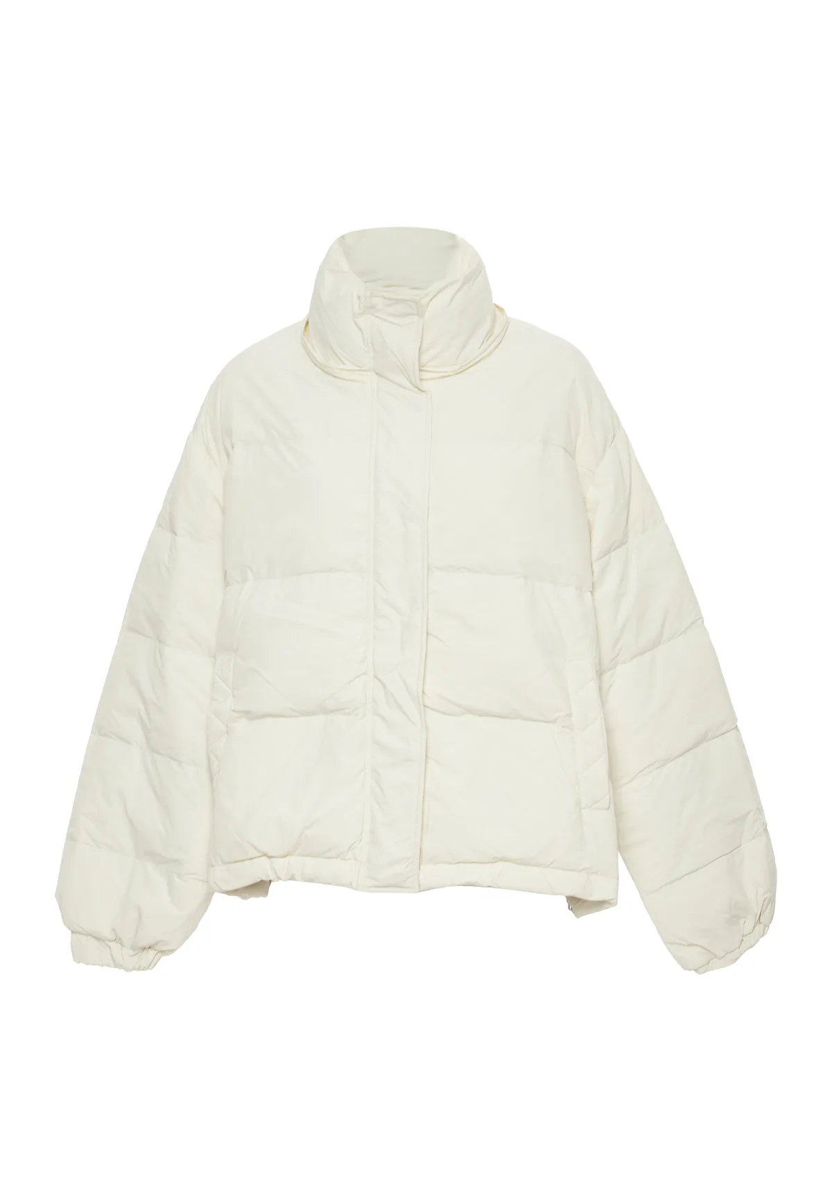 Ontdek een stijlvol pufferjack met hoge kraag en ritssluiting aan de voorkant. Het gewatteerde ontwerp met horizontale stiksels zorgt voor gewatteerde delen voor extra comfort. Lange mouwen met elastische manchetten houden de warmte vast, terwijl de elastische zoom zorgt voor een goede pasvorm. Deze jas is gemaakt van een gladde, mogelijk waterbestendige stof en biedt een strakke en eenvoudige esthetiek, perfect voor kouder weer.