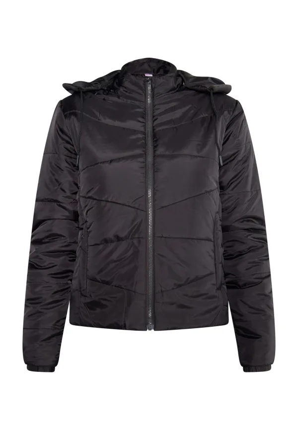 De lichte, glanzende en dun gewatteerde overgangsjassen van myMo zijn precies goed als het buiten frisser begint te worden. Dankzij de felle kleuren blijft de sfeer echter op midzomerniveau. De diagonaal gewatteerde look wordt in de mooiste stijl aangevuld door de zijzakken, de opstaande kraag en de afneembare capuchon met trekkoord en koord. Jas