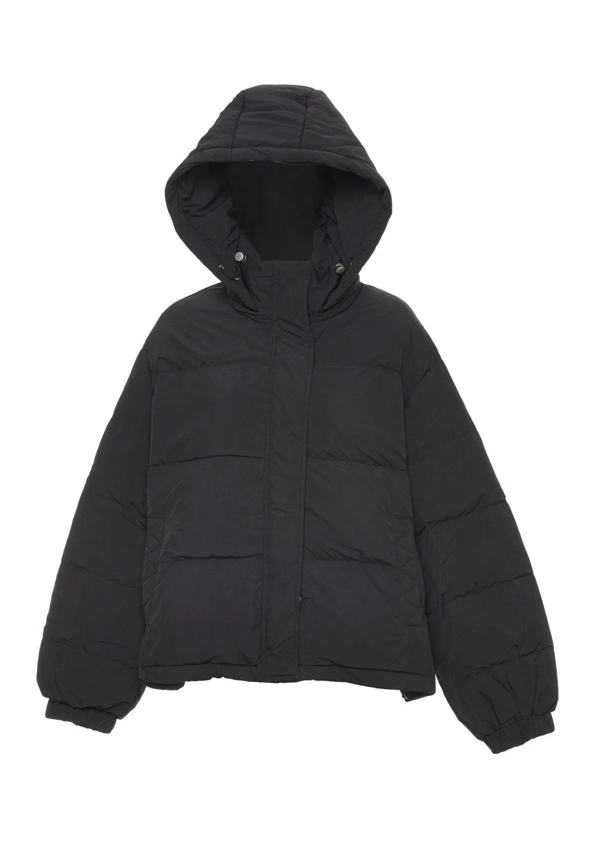 Ontdek een stijlvol pufferjack met hoge kraag en ritssluiting aan de voorkant. Het gewatteerde ontwerp met horizontale stiksels zorgt voor gewatteerde delen voor extra comfort. Lange mouwen met elastische manchetten houden de warmte vast, terwijl de elastische zoom zorgt voor een goede pasvorm. Deze jas is gemaakt van een gladde, mogelijk waterbestendige stof en biedt een strakke en eenvoudige esthetiek, perfect voor kouder weer.