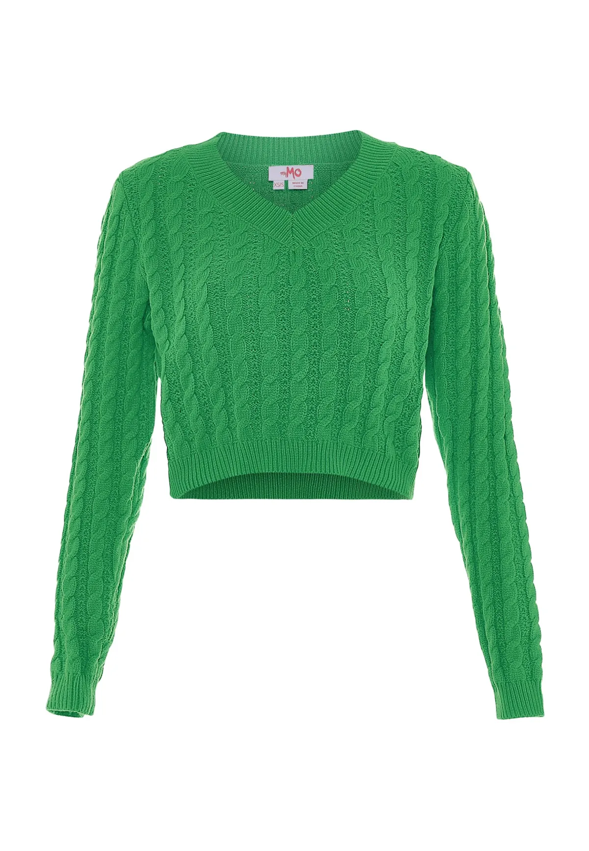 Truien zoals dit cropped model myMo doen het altijd. De zachte garenmix met viscose werd kabelgebreid en aangevuld met een V-hals. Pullover trui