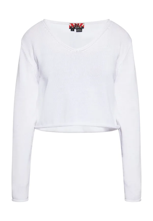 Maak kennis met een chique trui met V-hals, een cropped silhouet en lange mouwen. Deze gebreide trui heeft een all-over geribde textuur. De relaxte pasvorm valt moeiteloos, terwijl de zichtbare schoudernaad een vleugje moderniteit toevoegt. Dit stijlvolle exemplaar is ontworpen om het middenrif bloot te leggen voor een trendy look. Jumper