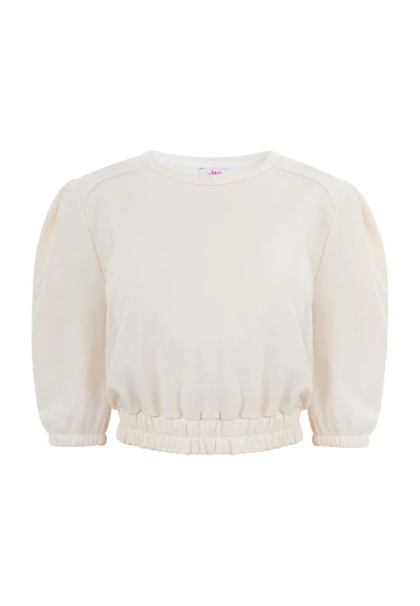 Het sweatshirt van myMo heeft een iets cropped model en een brede elastische tailleband. Met name de speelse pofmouwen met elastische manchetten en de siernaden op de schouders geven het model made in Italy een stoere, moderne look. Het design is gemaakt van een zachte katoenmix die comfortabel is om te dragen in de zomer. jumper